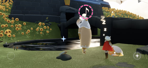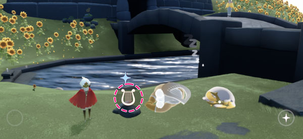 ▲ 池の前で寝ている笑う光採取者の元へ行き、楽器のアイコンを押す