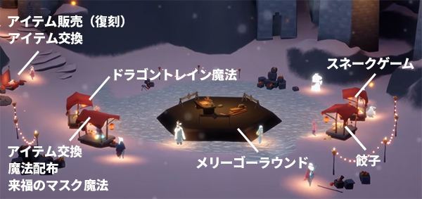 来福会場の夢見の町にいる慎み深い踊り手(餃子屋台の隣)にワープさせてもらいましょう。ワープ先でそのままサークルに座ればスネークゲーム開始です